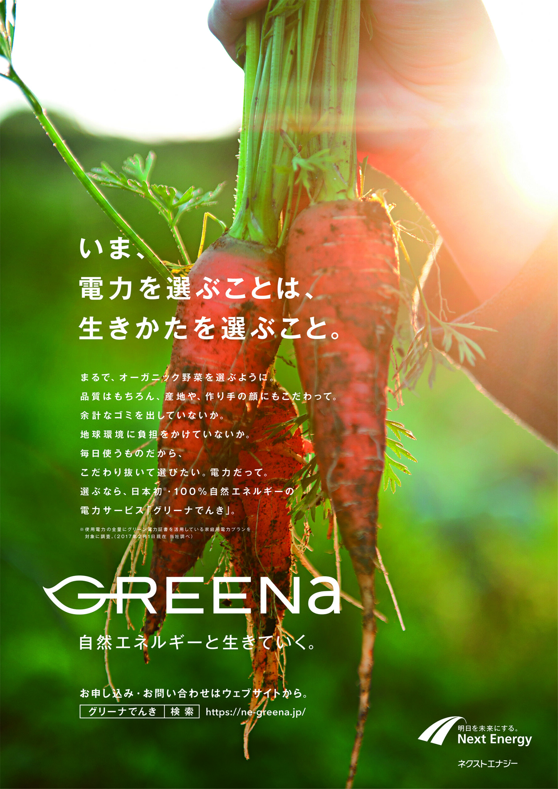 いま、電力を選ぶことは、生きかたを選ぶこと。 2015年 EcologyEnergyMagazine adSDGsTagline GREENa タグライン 雑誌広告 東日本大震災後、急速に需要が高まった自然エネルギー。そのサービスのブランドタグライン「自然エネルギーと生きていく」と雑誌広告を制作しました。キャッチコピーに当時の時代の気分が表れています。