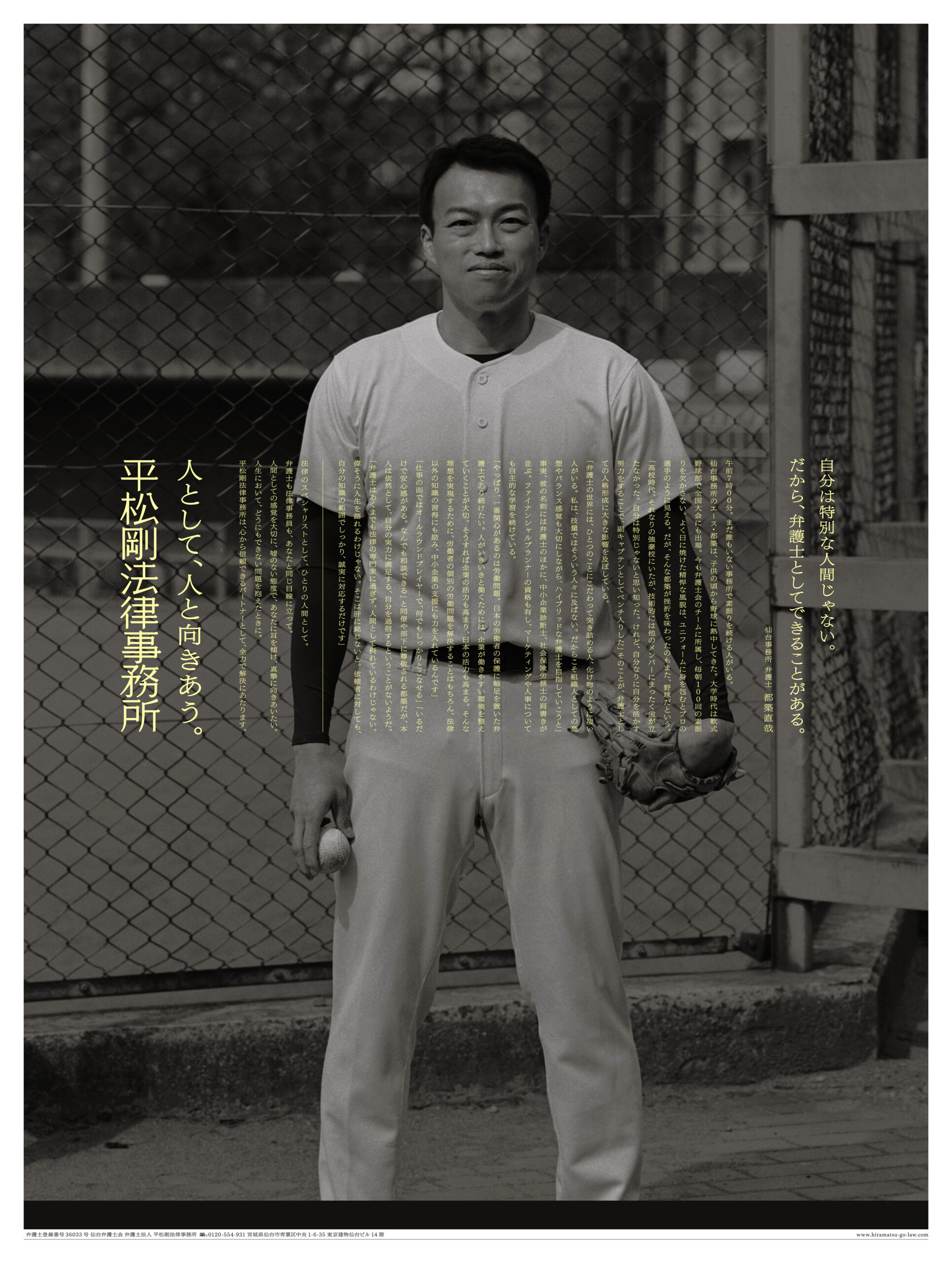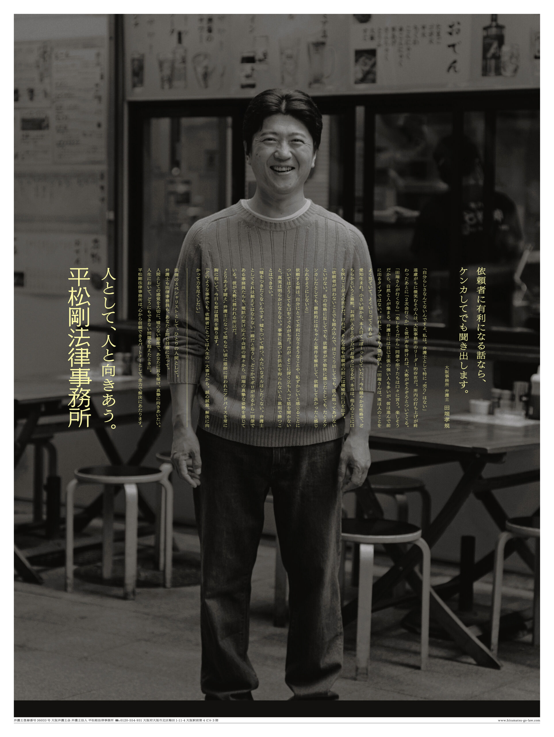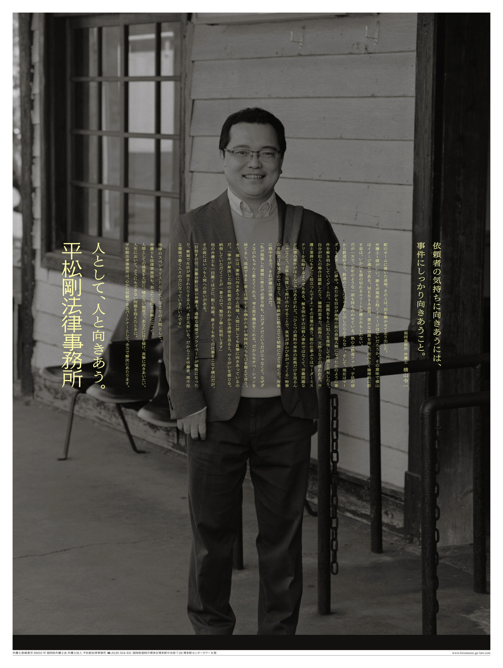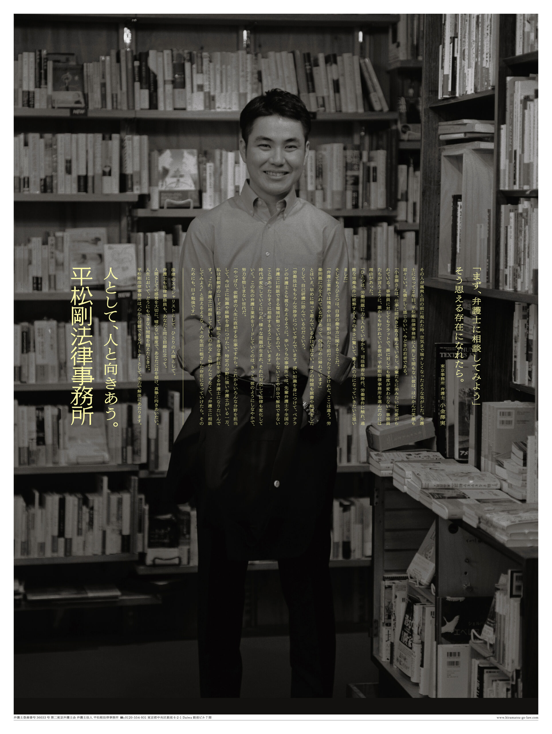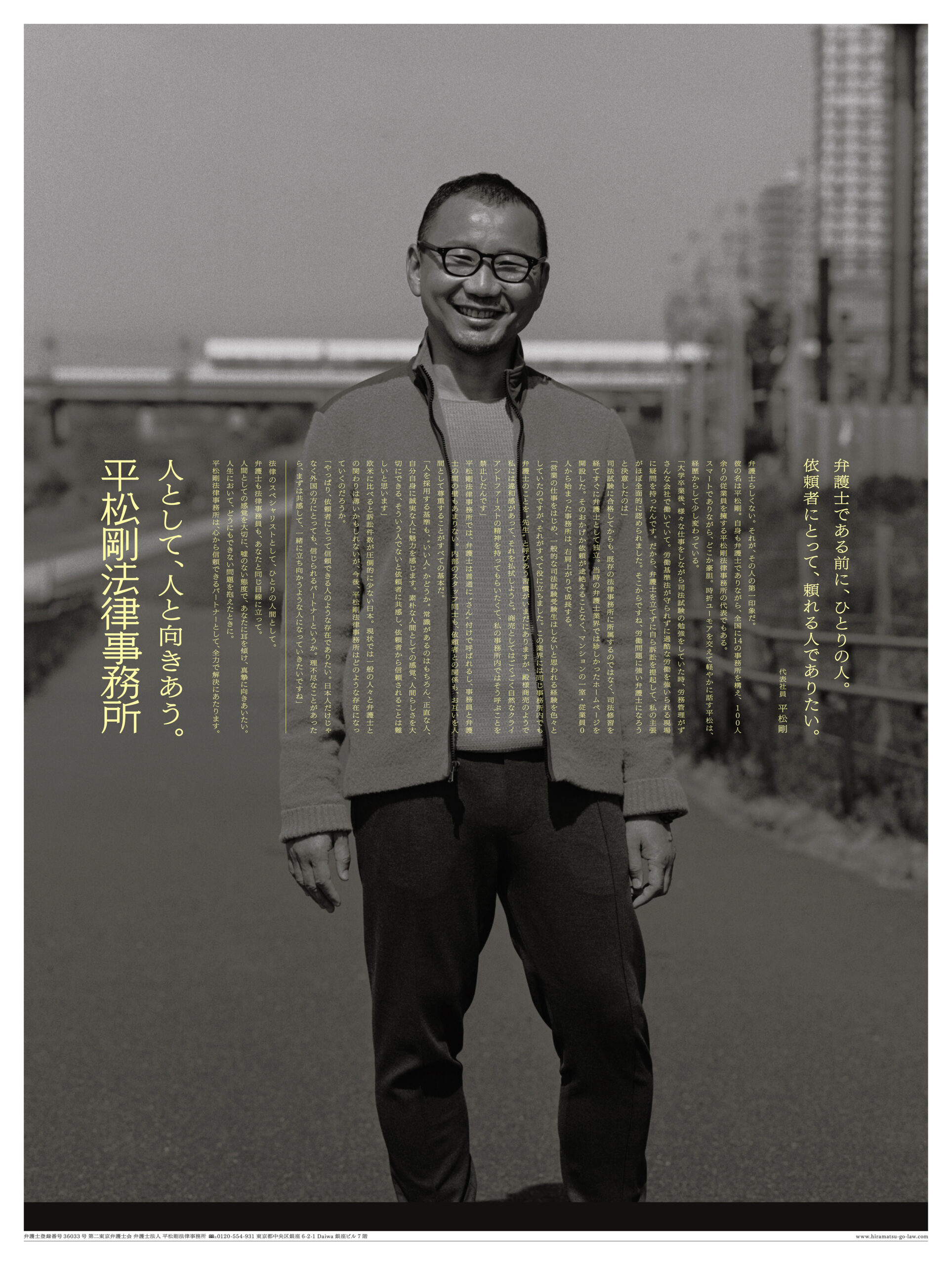 人として、人と向きあう。 2023年 Corporate adCorporate MessageLaw farmNewspaper adStatementTagline 平松剛法律事務所 コーポレートメッセージ 新聞広告 制作したコーポレートメッセージの通りに、所属の弁護士の方々に取材をして、法律事務所としては珍しく「人」が見える新聞広告を制作しました。