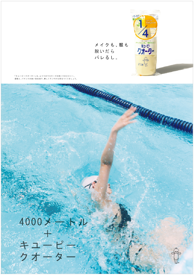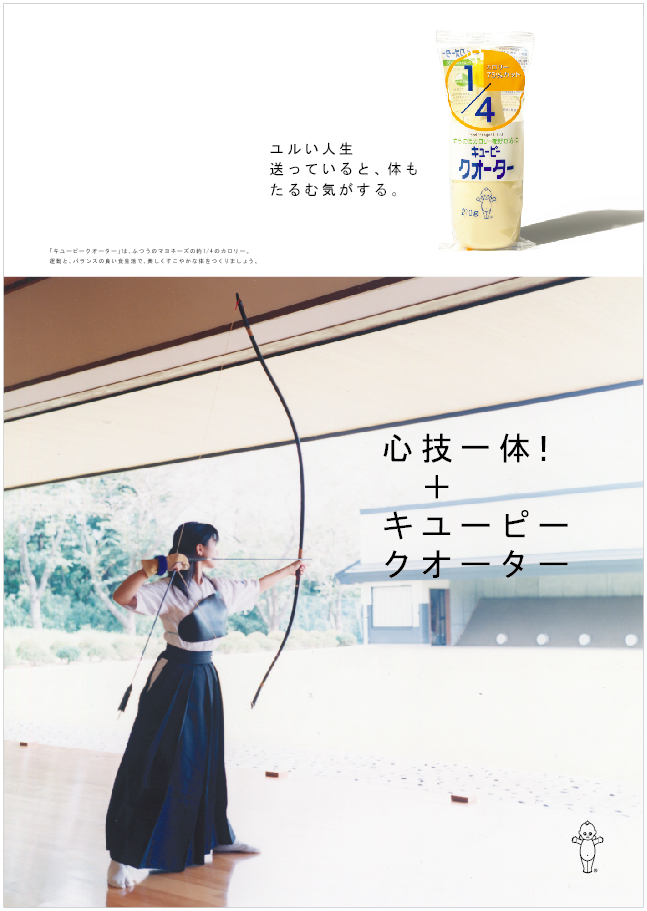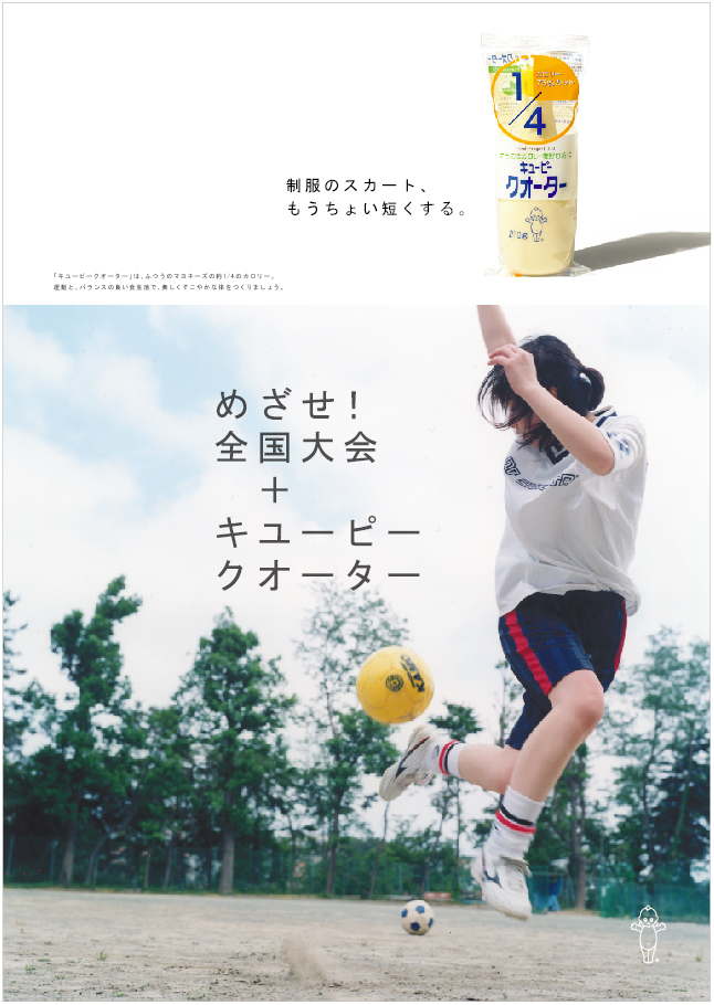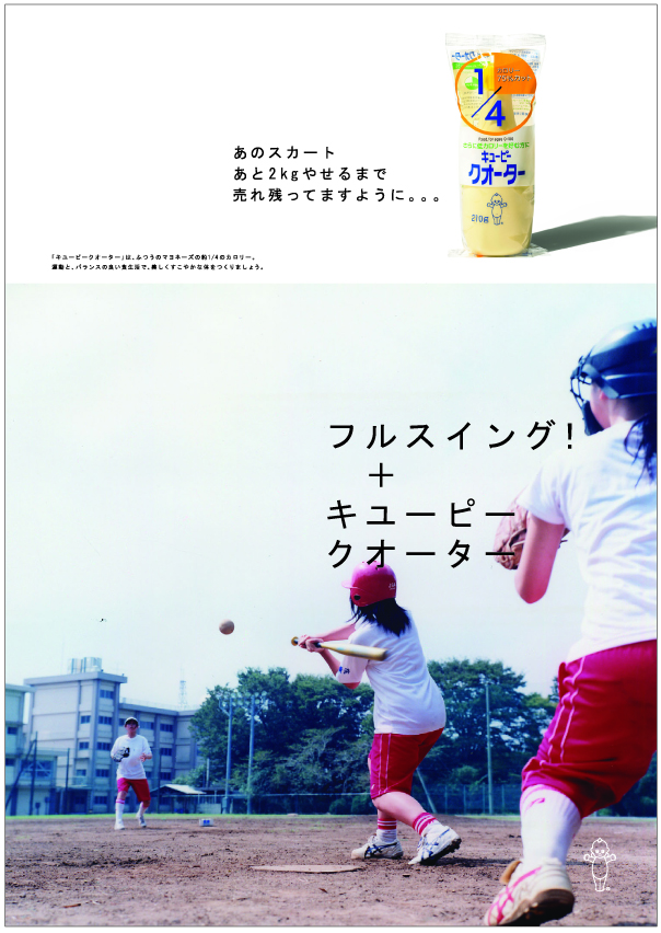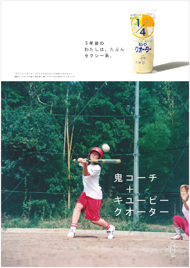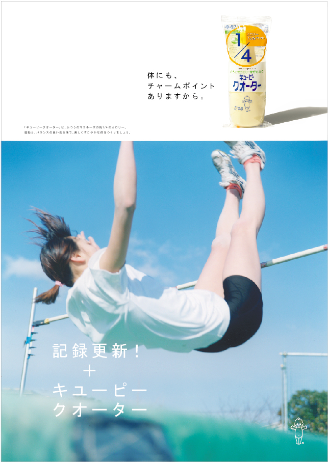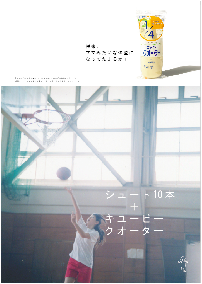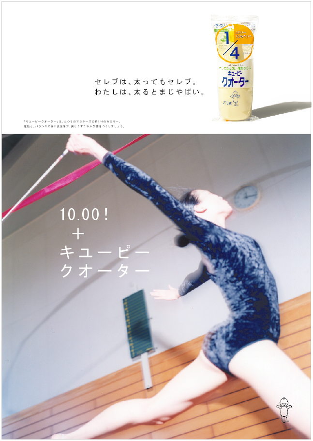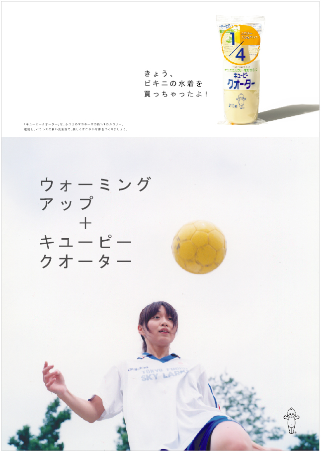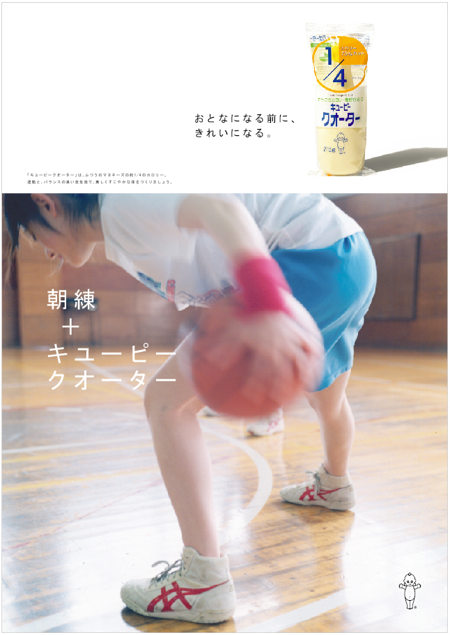 朝練+キユーピークオーター 2004年 FoodMagazine ad キューピークォーター 雑誌広告 カロリー1/4の「キューピークォーター」(現在は販売終了)、若年層へのプロモーション。ダイエットに関心のある若い世代に向けて、「部活」をテーマに、食事制限などの無理なダイエットではなく、運動と健康的な食事で理想の自分に近づこうというメッセージを1年間にわたって発信しました。写真は川内倫子さんによるもの。