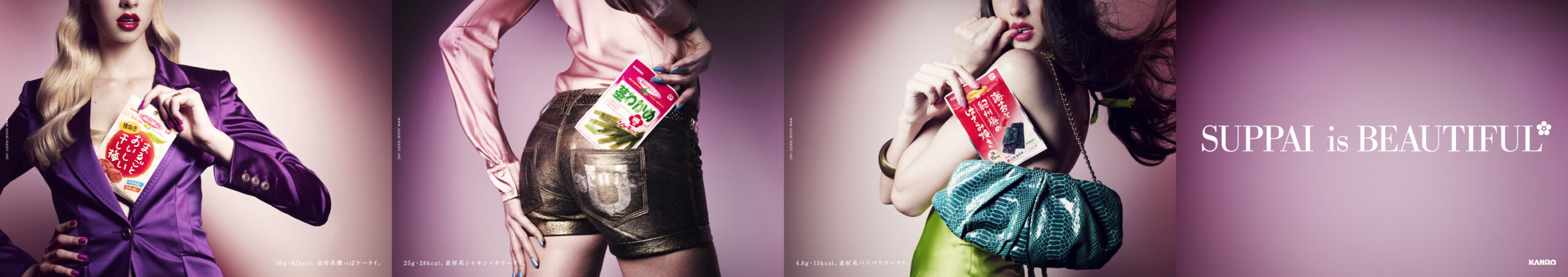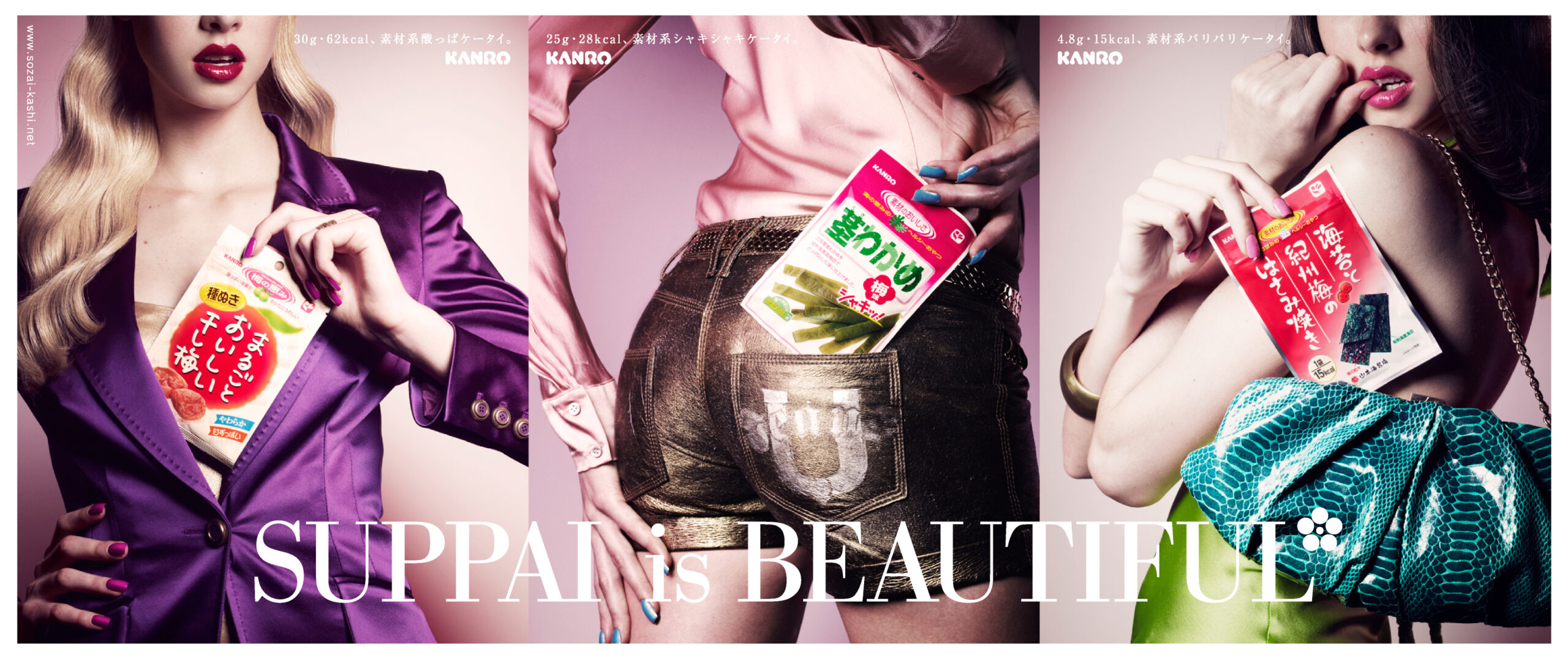 SUPPAI is BEAUTIFUL 2008年頃 Product CampaignSweetsTransportation advertising カンロ 素材菓子シリーズ 交通広告 カンロの素材菓子シリーズの広告。干し梅や海苔といったヘルシーな和風の商品を、あえてファッション的な(当時の携帯電話の広告のような)トーンで見せています。