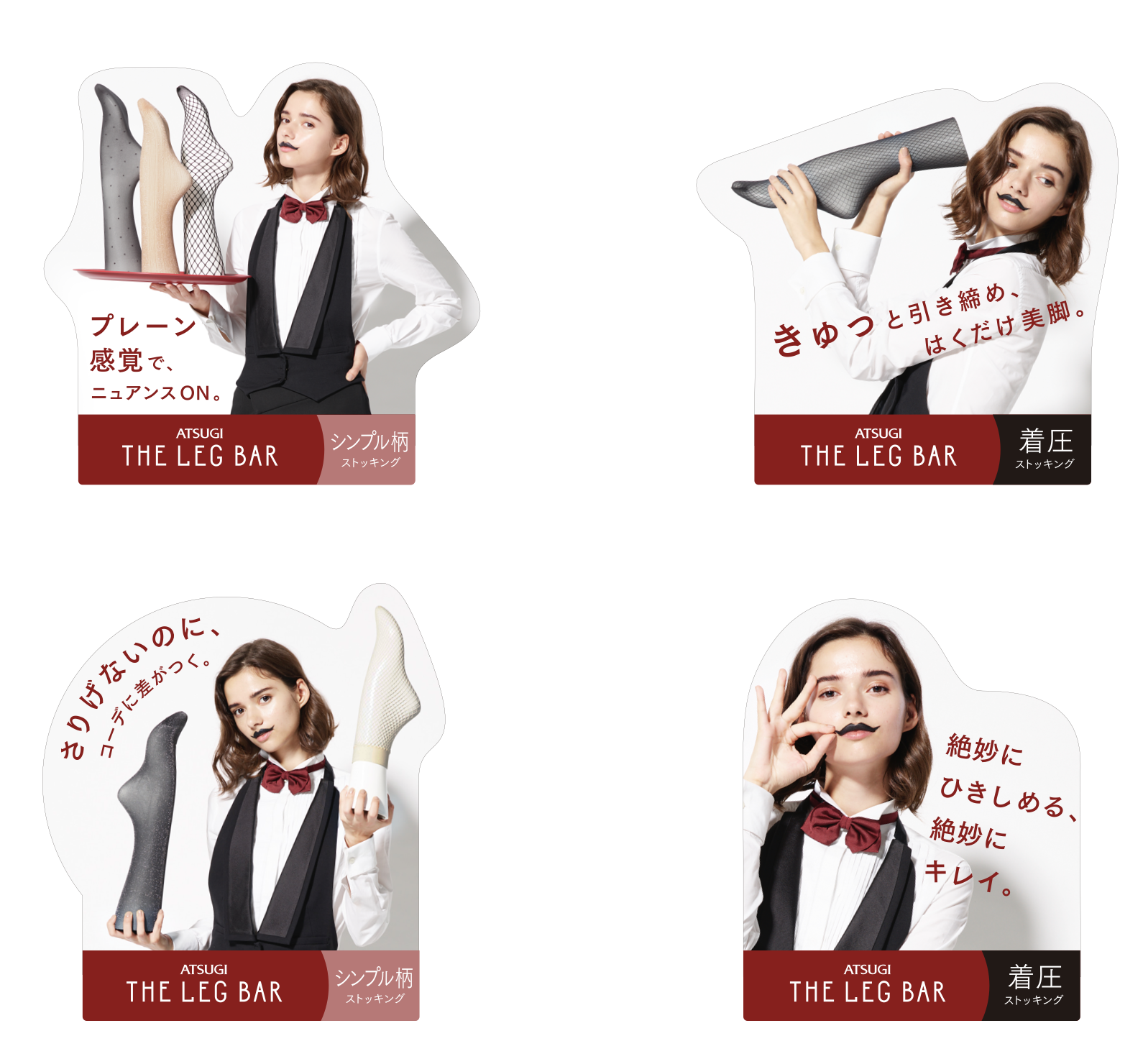 THE LEG BAR 2020年 ApparelBeautyFashionIn store toolsLeg wearNamingPackage copy ATSUGI 「THE LEG BAR」ネーミング、パッケージコピーなど 柄ストッキングを扱うブランドのネーミング「THE LEG BAR」を制作しました。また、パッケージや店頭のコピーもトータルで制作。