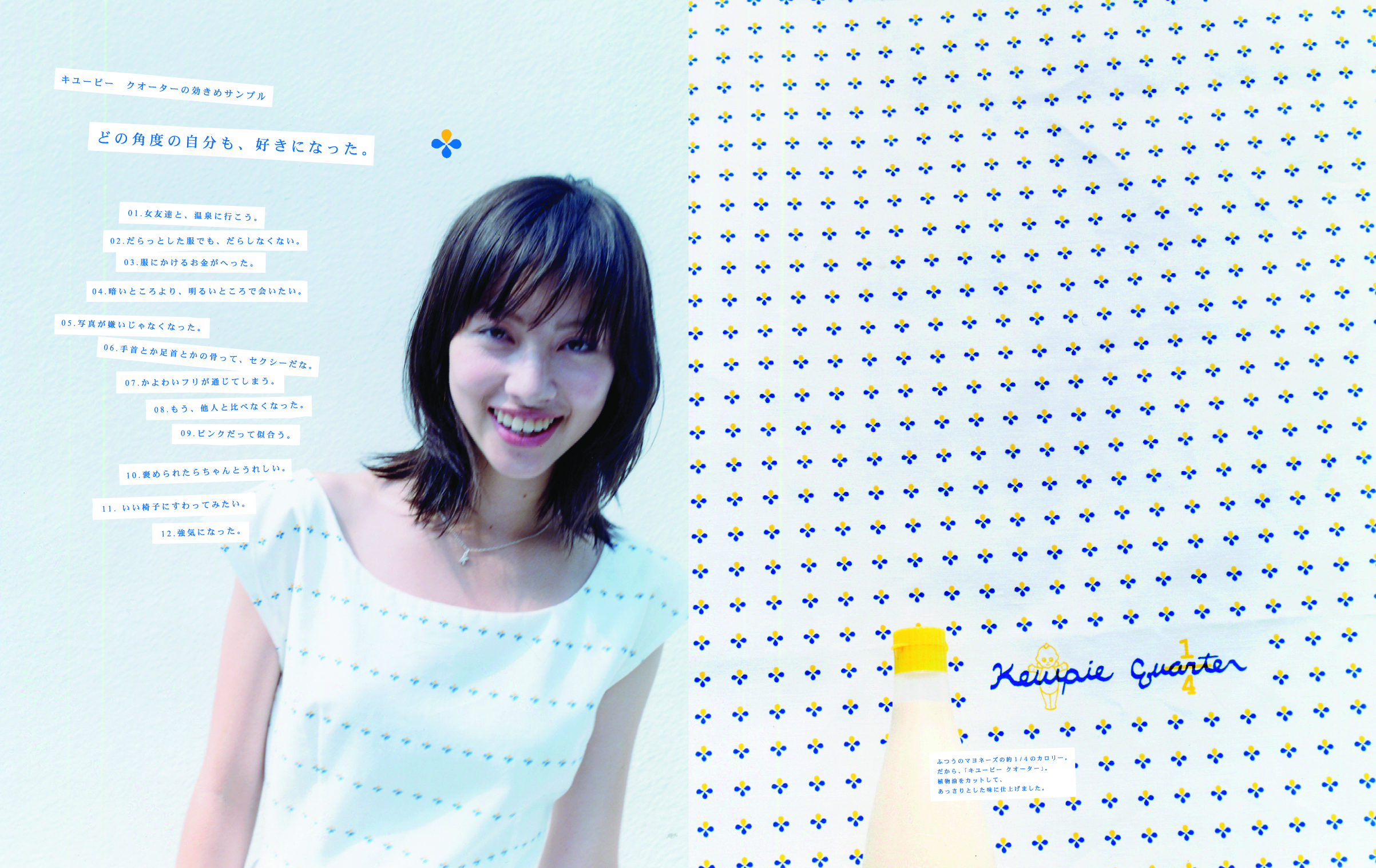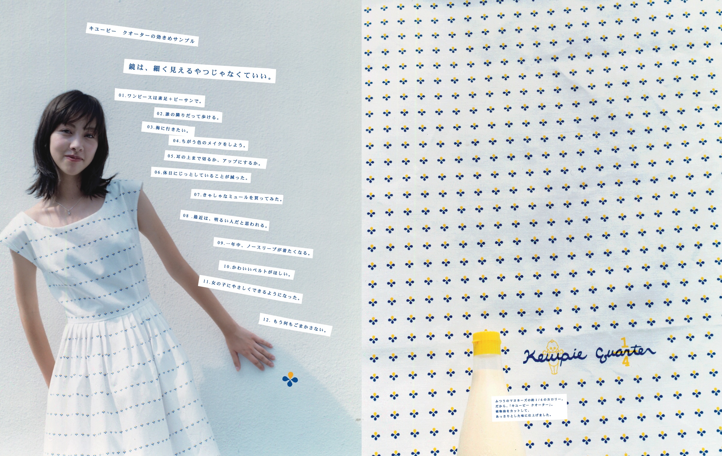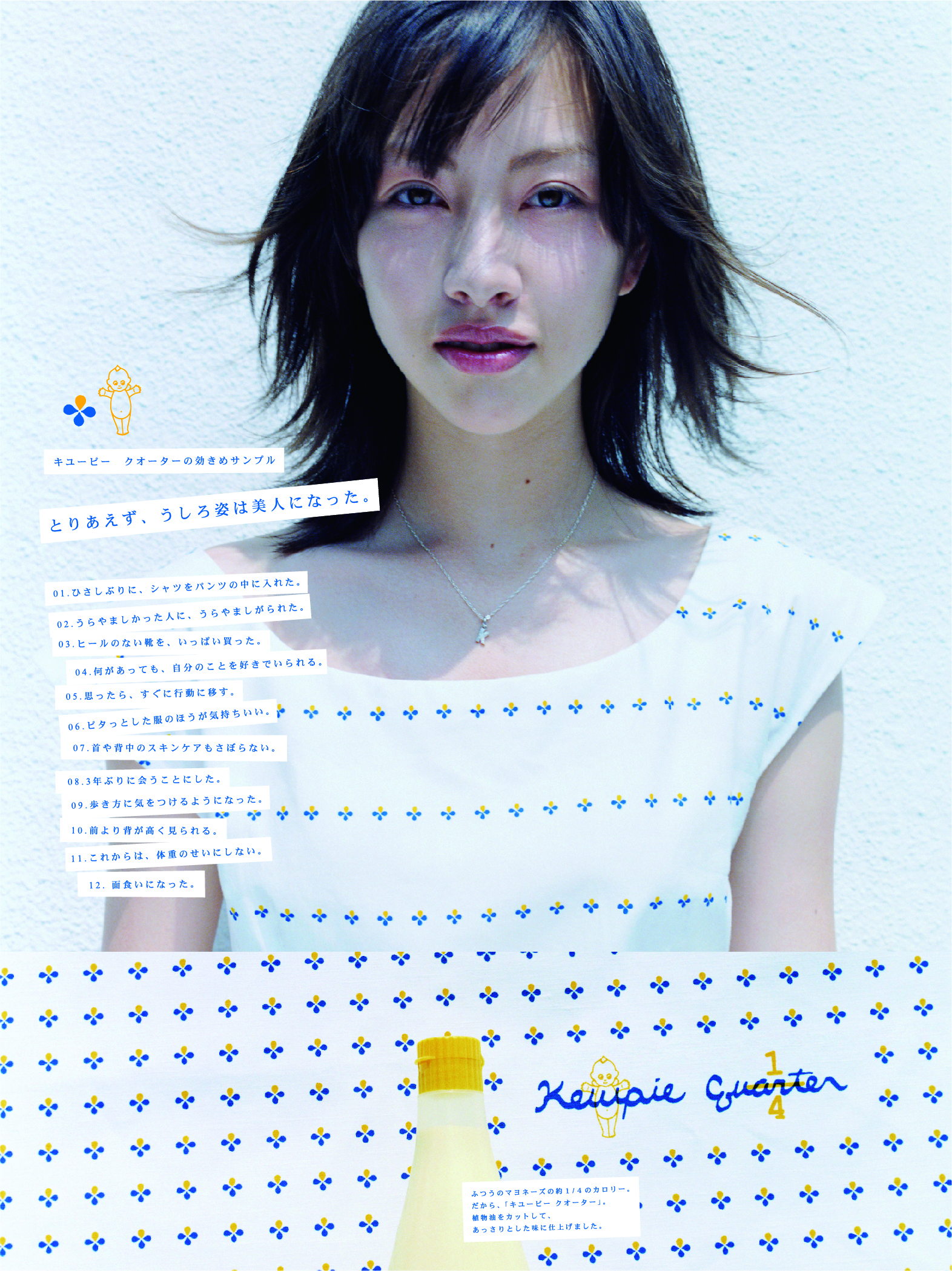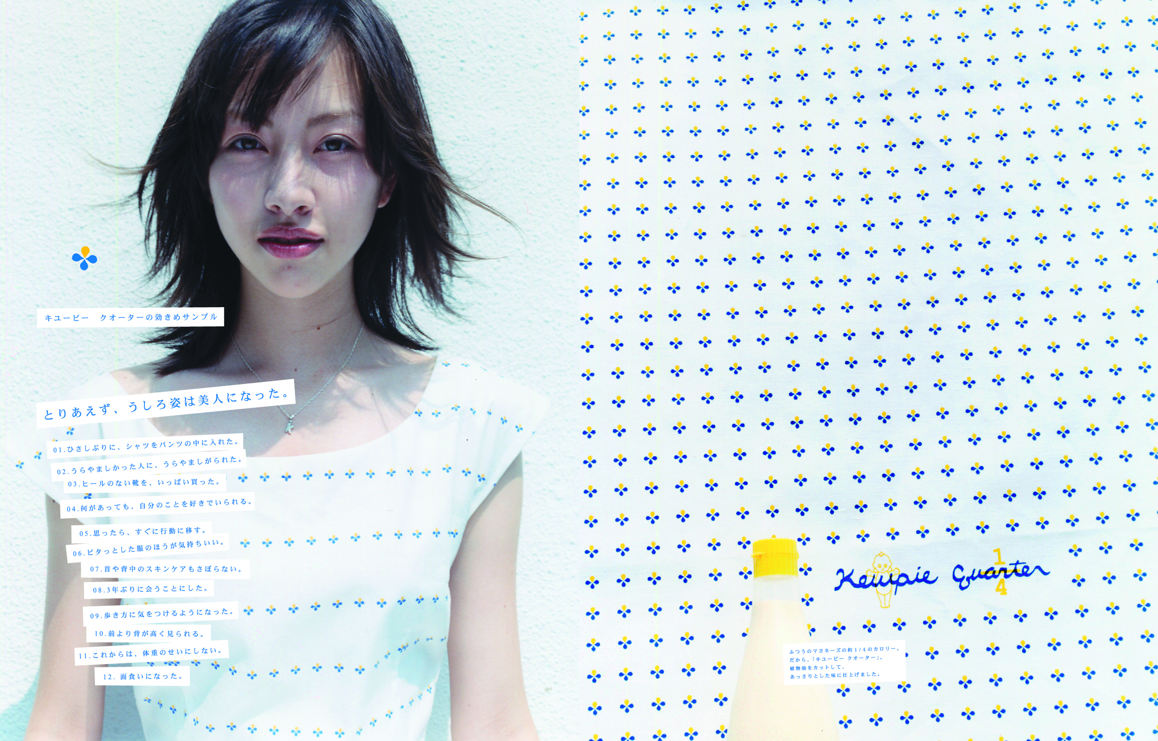 とりあえず、うしろ姿は美人になった。 2004年 DietFashionFoodHealth CareKewpie キューピー「キューピークォーター」雑誌広告 キューピー「キューピークォーター」(当時存在した、カロリー1/4のマヨネーズタイプ調味料)の雑誌広告。きちんと食べたいけれどダイエットもしたい、若い女性の気持ちを表現しています。ビジュアルに使用している特徴的なパターンの型紙付き。ファッション感度の高いターゲット層にアプローチしていました。