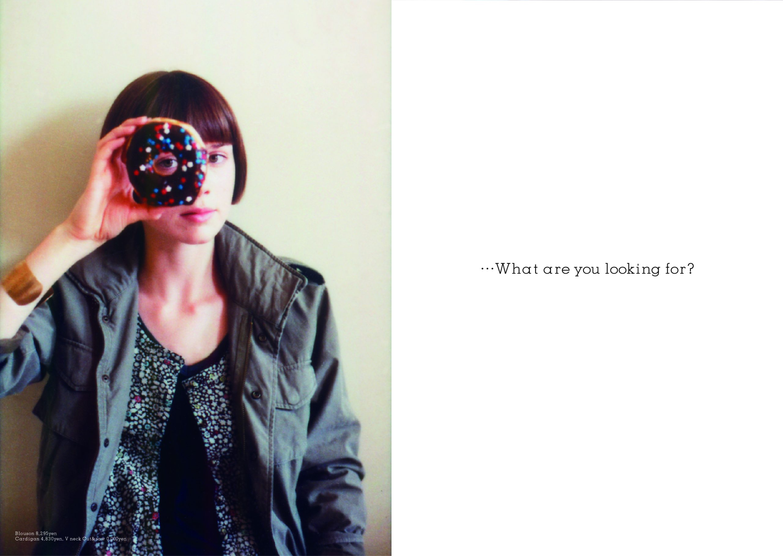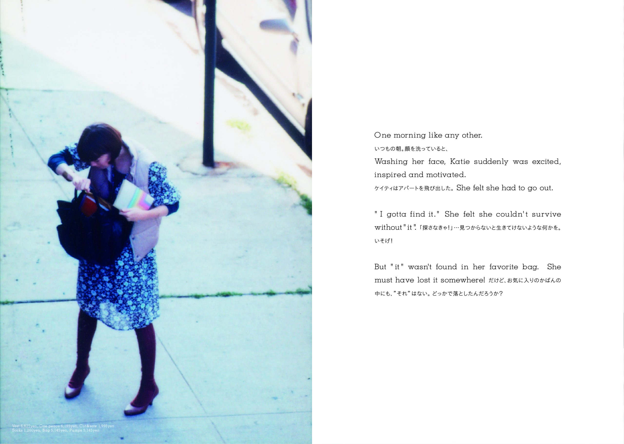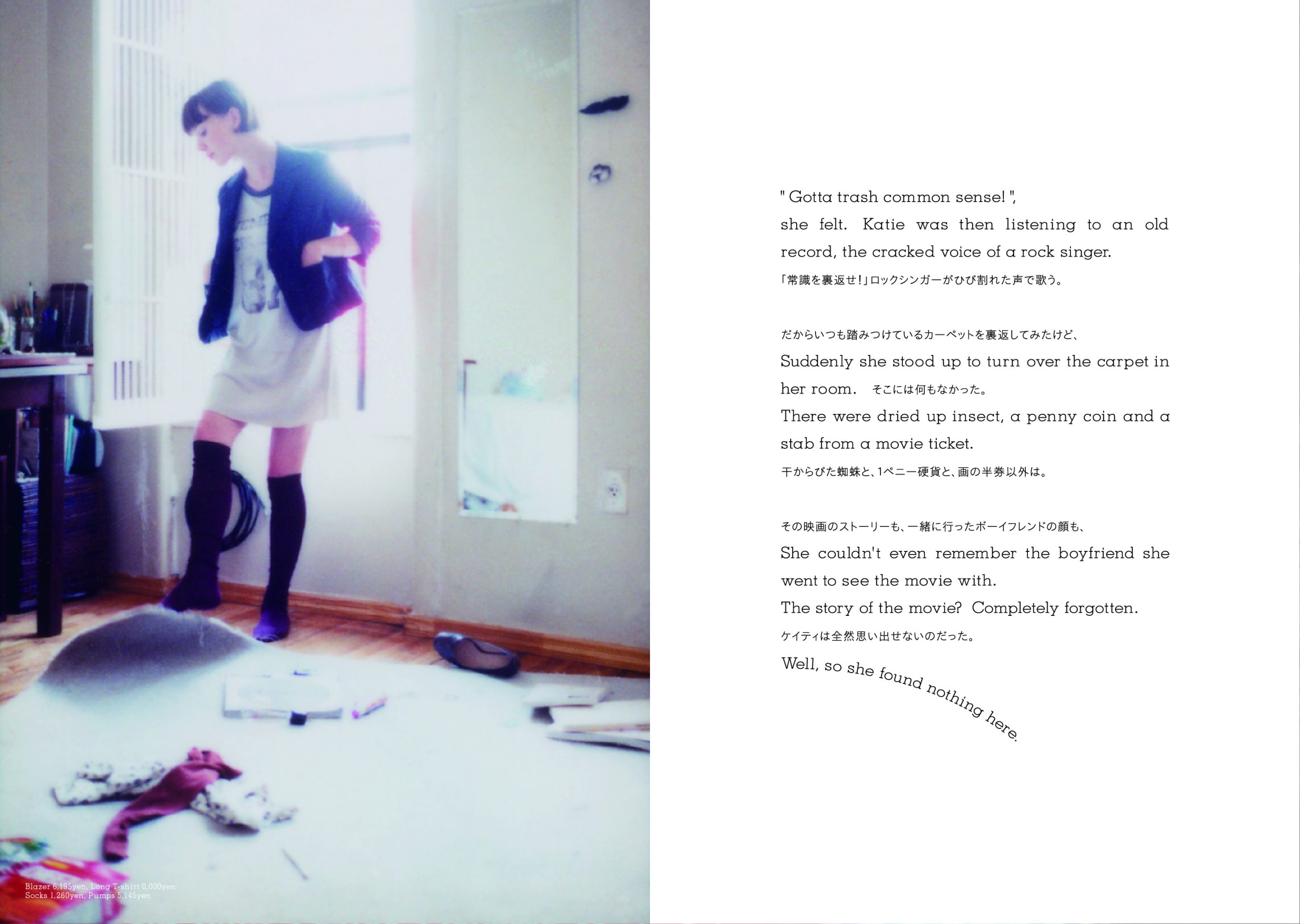 残っていたのは、アボガドの匂いだけ。ここからメキシコは遠すぎる。 2007年 ApparelCatalogFashionStory LAWRYS FARM カタログ「What is she looking for?」 ファッションブランド「ローリーズファーム」のカタログ。彼女はいったい何を探しているのだろう?ある女の子がいろんな方法で自分探しをする過程を、ユニークなショートストーリーで表現しています。(英訳は専門のコピーライターの方にお願いしています)