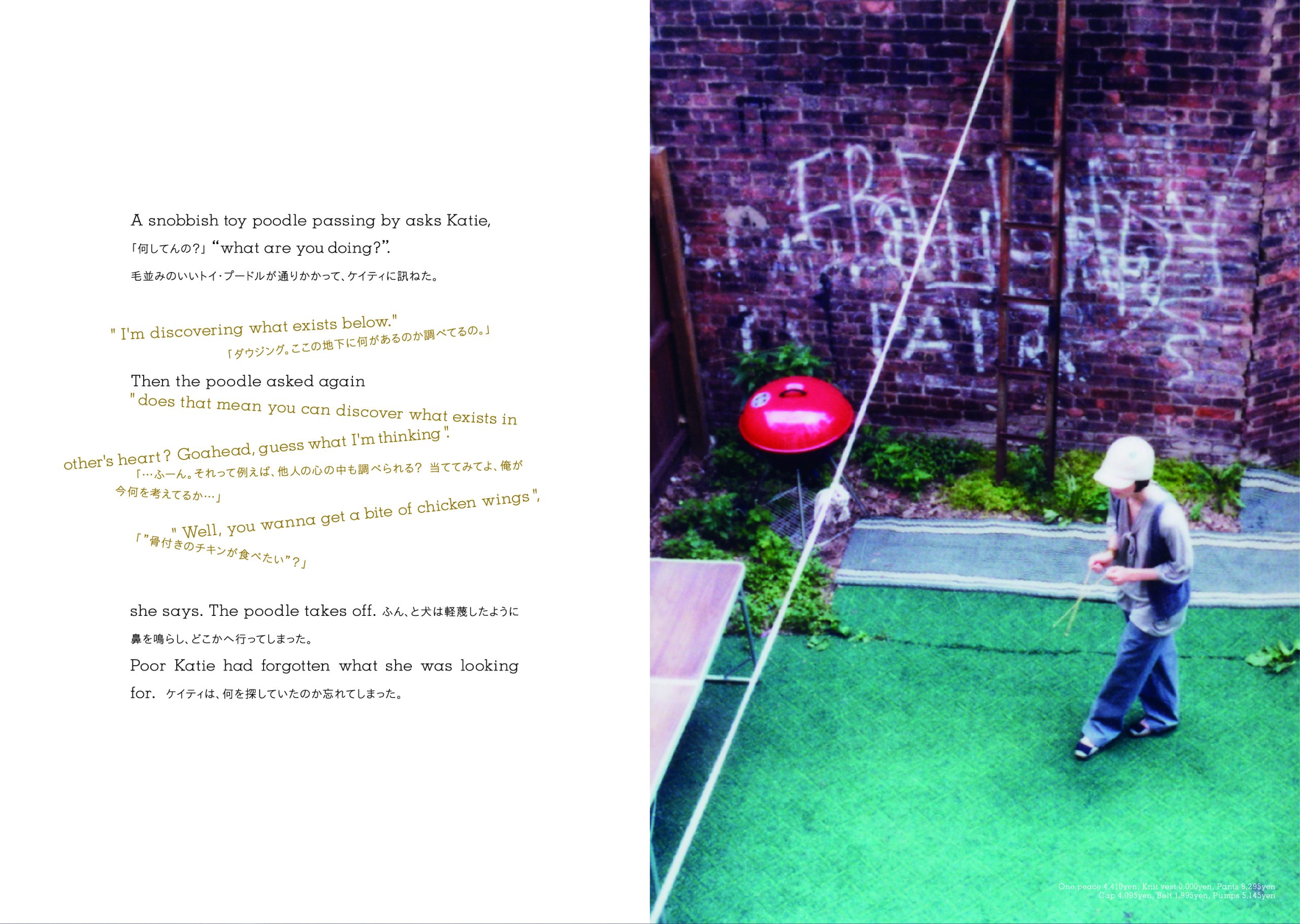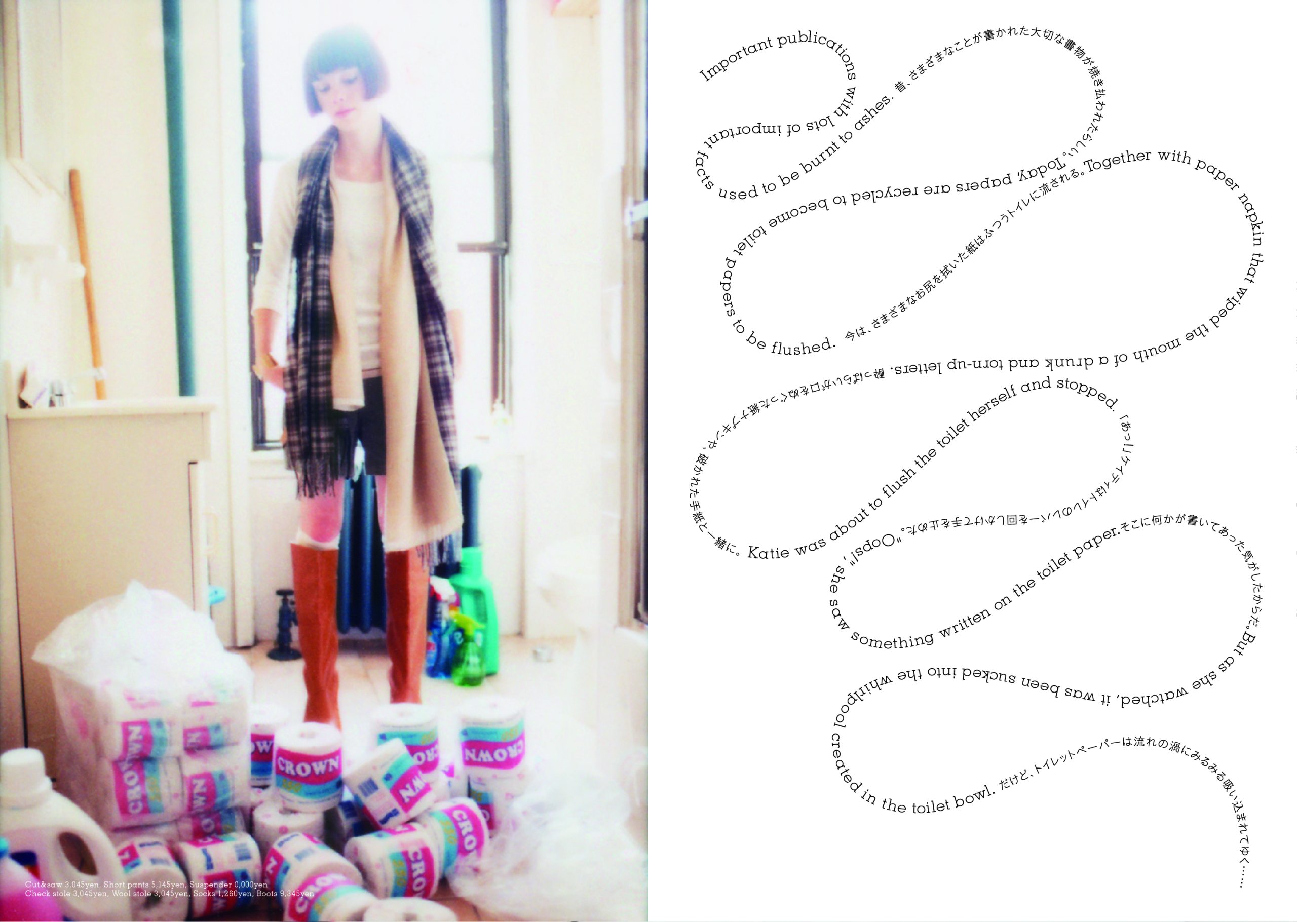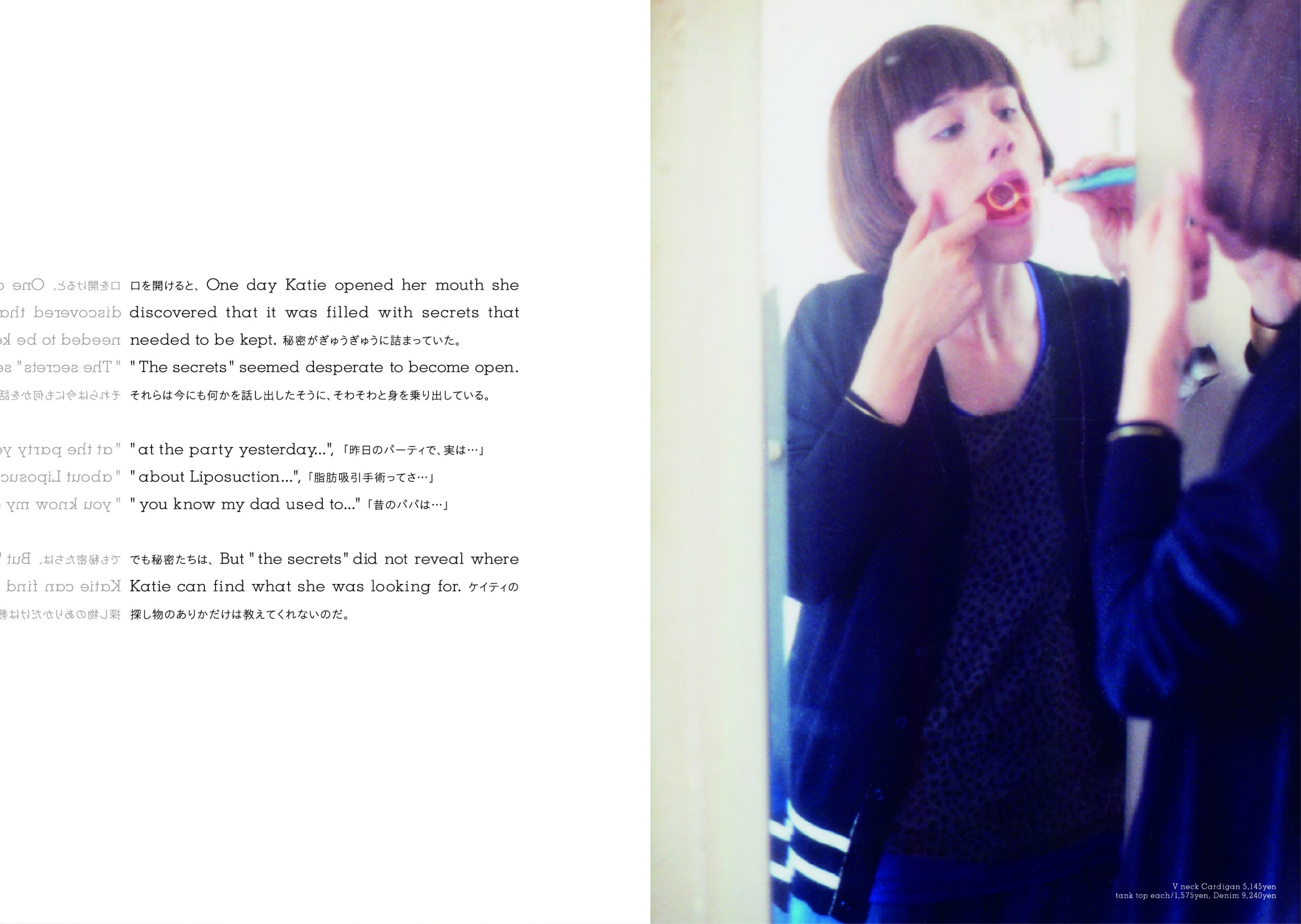 残っていたのは、アボガドの匂いだけ。ここからメキシコは遠すぎる。 2007年 ApparelCatalogFashionStory LAWRYS FARM カタログ「What is she looking for?」 ファッションブランド「ローリーズファーム」のカタログ。彼女はいったい何を探しているのだろう?ある女の子がいろんな方法で自分探しをする過程を、ユニークなショートストーリーで表現しています。(英訳は専門のコピーライターの方にお願いしています)