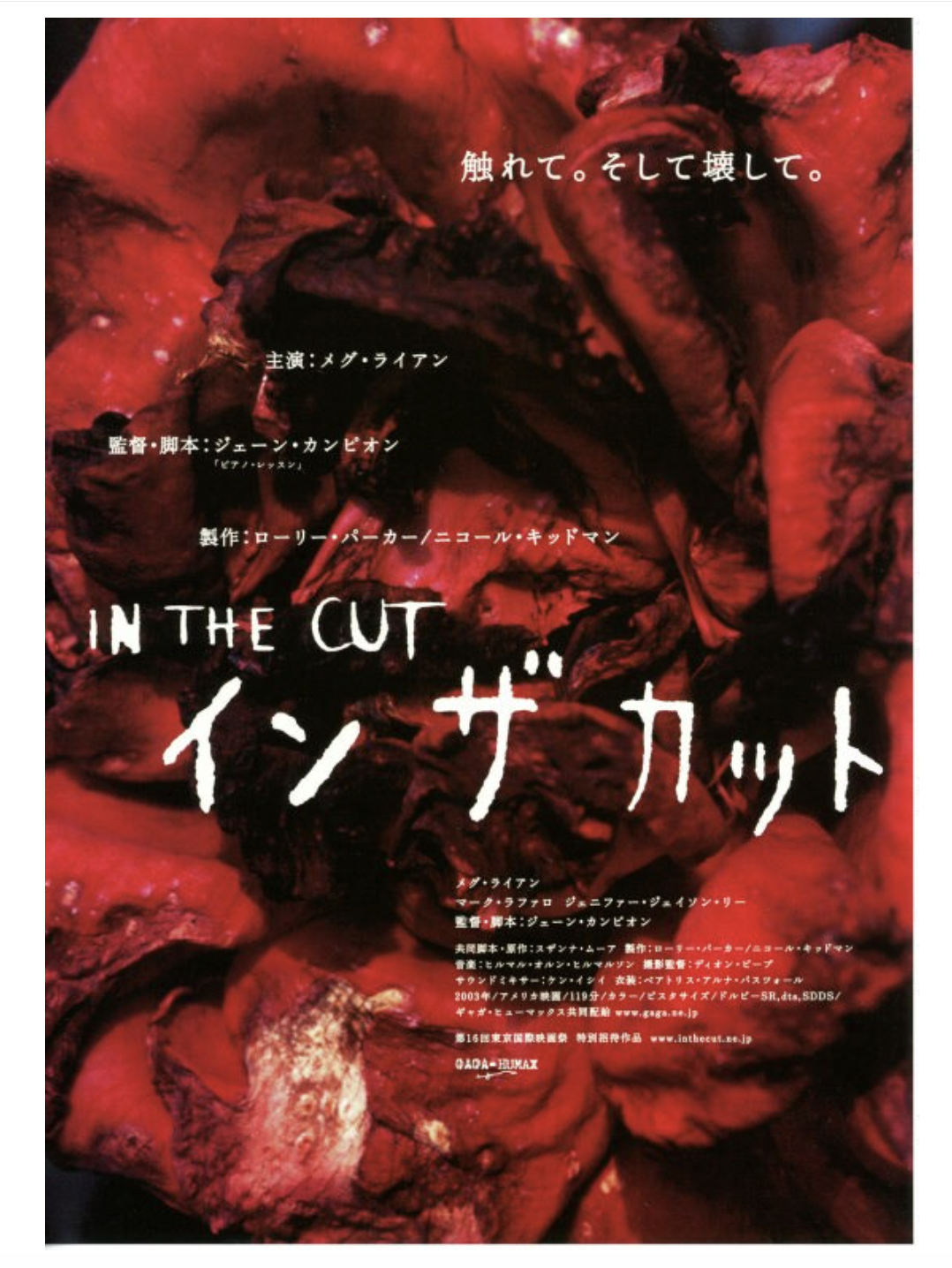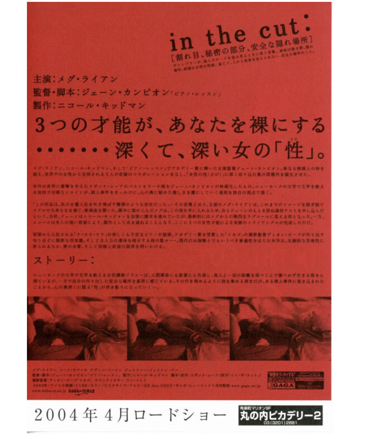 触れて。そして壊して。 2004年 ArtFlyerMovie 映画「イン・ザ・カット」 宣伝チラシ 2004年に日本公開されたジェーン・カンピオン(「ピアノ・レッスン」など)監督の映画「イン・ザ・カット」の販促用チラシ。邦題やプロモーションコピーを担当させていただきました。ビジュアルは写真違いで数バリエーションあります。