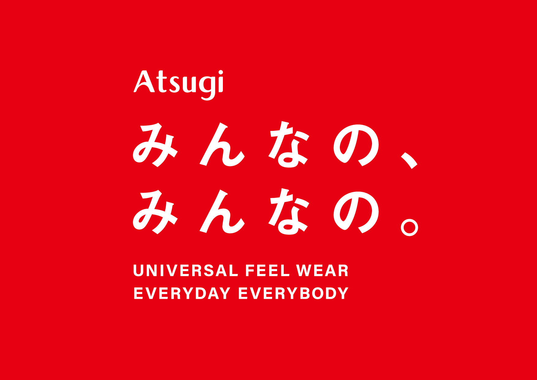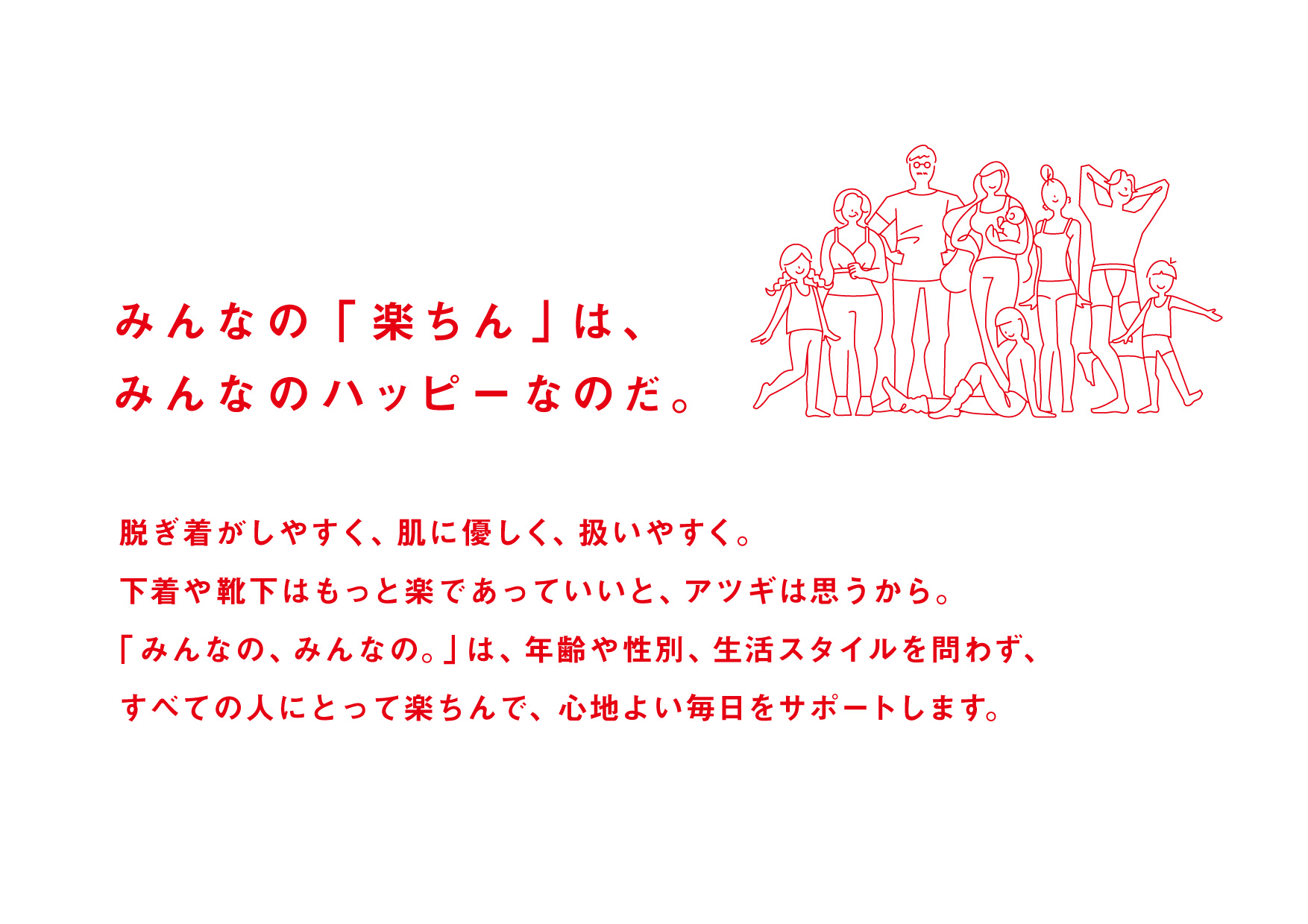 みんなの「楽ちん」は、みんなのハッピーなのだ。 2023年 ApparelFashionIn store toolsNamingProduct name ATSUGI 「みんなの、みんなの。」ネーミング&ステートメント 誰にとっても心地よい靴下やインナーのブランド「みんなの、みんなの。」のブランド名やステートメント、各アイテム名(「優しさだけでつくったパンツ」など)を制作しました。